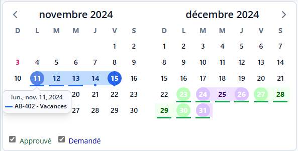 Holidays are shown in purple). Approved requests are in green. And those still pending approval are in blue. .