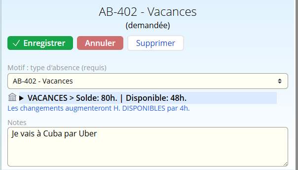 Employees can have time banks (vacation, sickness, overtimes, etc.) with entitlement deposited or earned, and time taken from the when the employee is absent. More about time banks